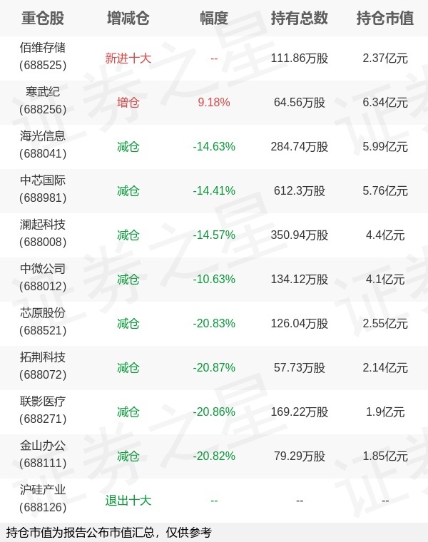 证券之星消息,4月22日广发基金旗下陆志明管理的广发上证科创板50成份交易型开放式指数基金公布一季报,近1年净值增长率39.76%。与上一季度相比,该基金前十大重仓股新增佰维存储;并对寒武纪增仓5.43万股,为该基金第一大重仓股;沪硅产业等退出前十大重仓股;详细数据如下: