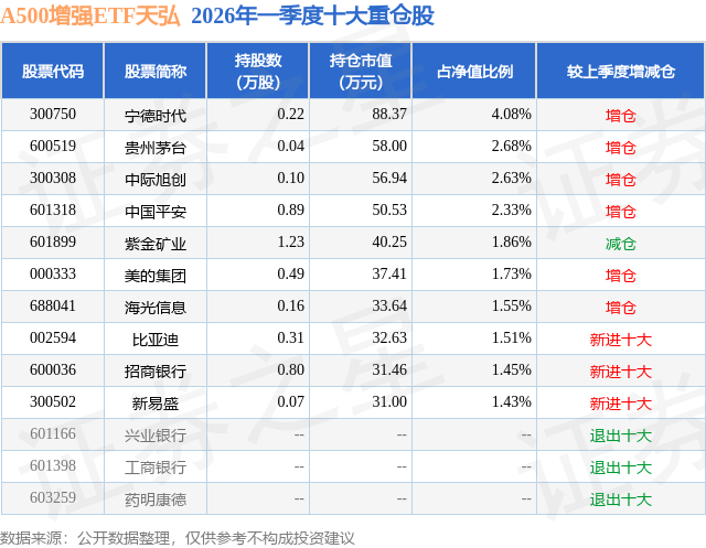 A500增强ETF天弘基金成立于2025年6月5日,基金经理为刘笑明,基金跟踪标的为中证A500指数,成立以来超额回报为1.5%,近一个月超额回报为0.67%。最新披露的基金持仓数据显示,截止2026年3月31日,该基金第一大重仓股为宁德时代(300750),持股占比为4.08%。