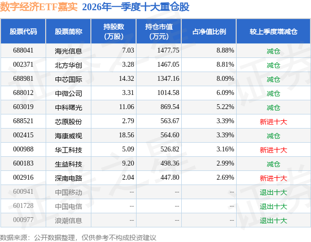 数字经济ETF嘉实基金成立于2025年5月22日,基金经理为尚可,基金跟踪标的为中证诚通国企数字经济指数,成立以来超额回报为2.46%,近一个月超额回报为0.48%。最新披露的基金持仓数据显示,截止2026年3月31日,该基金第一大重仓股为海光信息(688041),持股占比为8.88%。