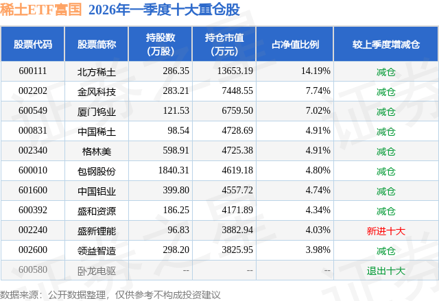 稀土ETF富国基金成立于2021年8月5日,基金经理为曹璐迪 殷钦怡,基金跟踪标的为中证稀土产业指数,成立以来超额回报为8.49%,近一个月超额回报为0.15%。最新披露的基金持仓数据显示,截止2026年3月31日,该基金第一大重仓股为北方稀土(600111),持股占比为14.19%。
