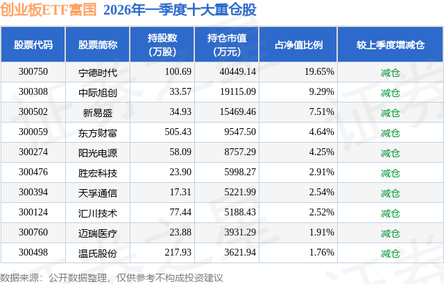 创业板ETF富国基金成立于2019年6月11日,基金经理为曹璐迪 殷钦怡,基金跟踪标的为创业板指数(价格),成立以来超额回报为-12.34%,近一个月超额回报为0.05%。最新披露的基金持仓数据显示,截止2026年3月31日,该基金第一大重仓股为宁德时代(300750),持股占比为19.65%。