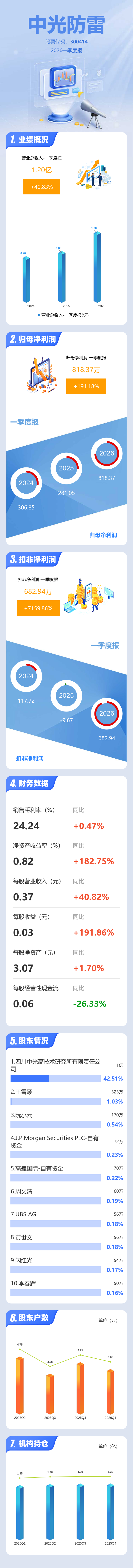 证券之星消息,中光防雷2026年一季报显示,一季度公司主营收入1.2亿元,同比上升40.83%;归母净利润818.37万元,同比上升191.18%;扣非净利润682.94万元,同比上升7159.86%;负债率17.23%,投资收益97.46万元,财务费用82.0万元,毛利率24.24%。