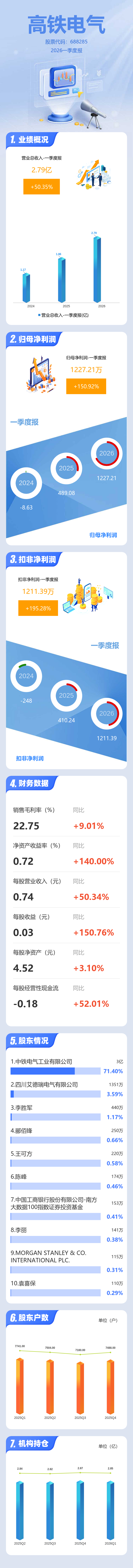 证券之星消息,高铁电气2026年一季报显示,一季度公司主营收入2.79亿元,同比上升50.36%;归母净利润1227.21万元,同比上升150.92%;扣非净利润1211.39万元,同比上升195.29%;负债率43.87%,财务费用-4.57万元,毛利率22.75%。