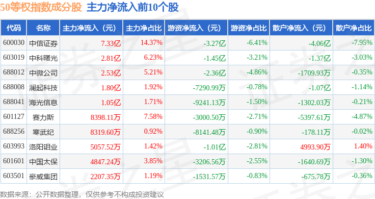 资金流向方面,50等权(000050)指数成份股当日主力资金净流出合计48.2亿元,游资资金净流入合计4.99亿元,散户资金净流入合计43.21亿元。成份股资金流向详情见下表: