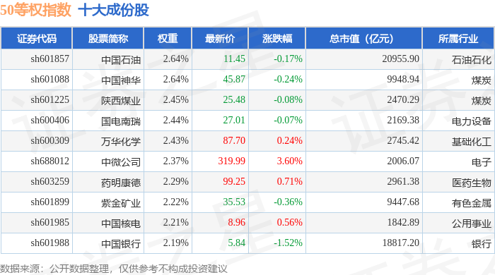 50等权(000050)指数十大成份股详情如下: