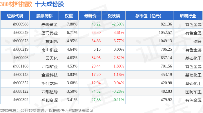 证券之星消息,4月22日,380材料(000105)指数报收于6250.23点,涨1.12%,成交400.99亿元,换手率2.08%。当日该指数成份股中,上涨的有27家,东阳光以6.77%的涨幅领涨,下跌的有20家,赤峰黄金以2.5%的跌幅领跌。
