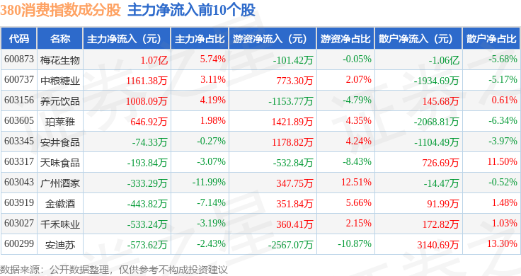 资金流向方面,380消费(000108)指数成份股当日主力资金净流入合计793.82万元,游资资金净流入合计1290.64万元,散户资金净流出合计2084.46万元。成份股资金流向详情见下表: