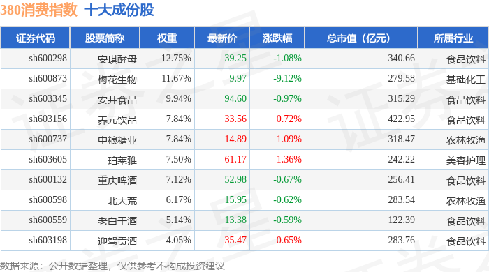 380消费(000108)指数十大成份股详情如下: