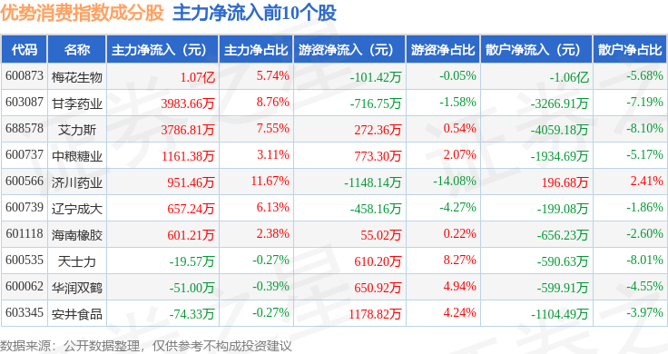 资金流向方面,优势消费(000147)指数成份股当日主力资金净流出合计8.29亿元,游资资金净流入合计2.08亿元,散户资金净流入合计6.21亿元。成份股资金流向详情见下表: