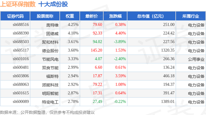 证券之星消息,4月22日,上证环保(000158)指数报收于1460.89点,涨0.12%,成交349.86亿元,换手率1.18%。当日该指数成份股中,上涨的有20家,固德威以4.4%的涨幅领涨,下跌的有19家,聚和材料以3.89%的跌幅领跌。