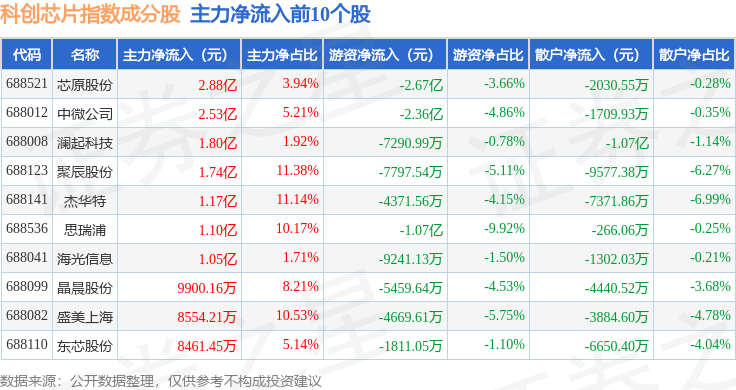 资金流向方面,科创芯片(000685)指数成份股当日主力资金净流入合计9.05亿元,游资资金净流出合计6.94亿元,散户资金净流出合计2.11亿元。成份股资金流向详情见下表:
