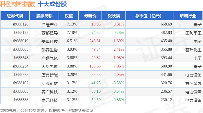 证券之星消息,4月22日,科创材料(000689)指数报收于1426.44点,涨1.21%,成交334.34亿元,换手率3.33%。当日该指数成份股中,上涨的有35家,华特气体以15.84%的涨幅领涨,下跌的有15家,广大特材以10.0%的跌幅领跌。