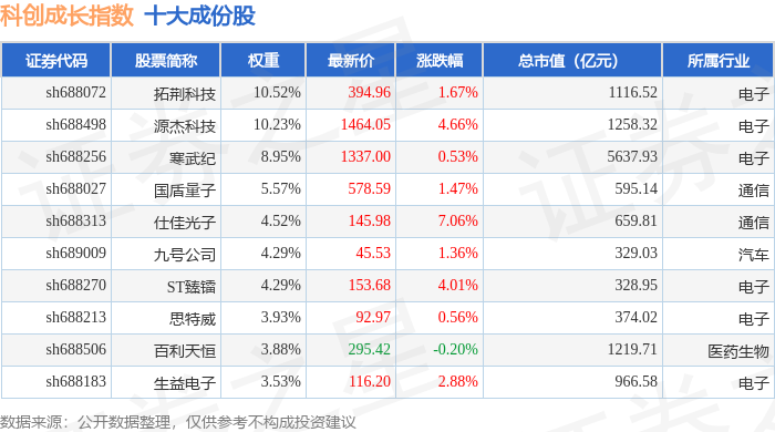 科创成长(000690)指数十大成份股详情如下: