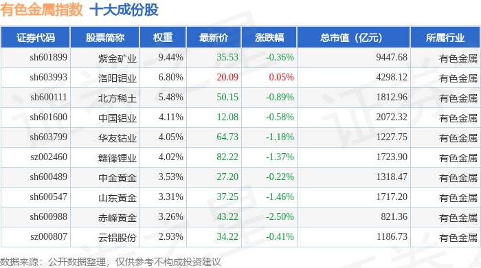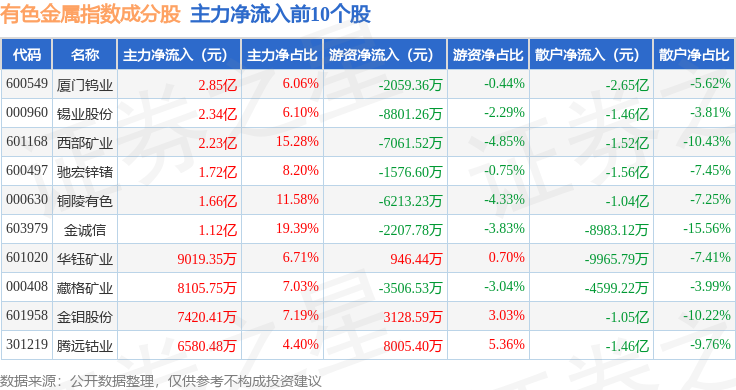 资金流向方面,有色金属(000819)指数成份股当日主力资金净流出合计46.35亿元,游资资金净流入合计7.18亿元,散户资金净流入合计39.17亿元。成份股资金流向详情见下表: