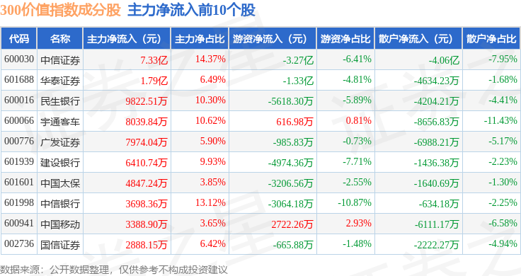 资金流向方面,300价值(000919)指数成份股当日主力资金净流出合计64.18亿元,游资资金净流入合计18.08亿元,散户资金净流入合计46.1亿元。成份股资金流向详情见下表: