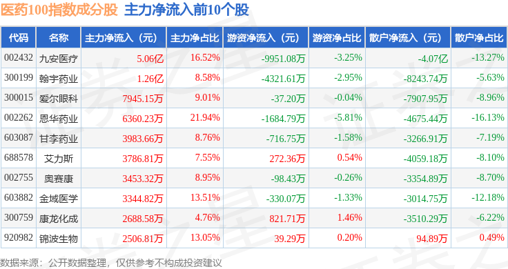 资金流向方面,医药100(000978)指数成份股当日主力资金净流出合计2.09亿元,游资资金净流入合计9720.72万元,散户资金净流入合计1.39亿元。成份股资金流向详情见下表: