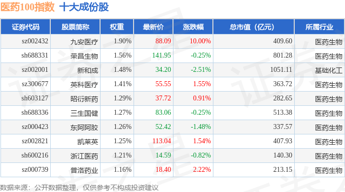 证券之星消息,4月22日,医药100(000978)指数报收于10495.83点,涨0.79%,成交395.32亿元,换手率1.1%。当日该指数成份股中,上涨的有62家,九安医疗以10.0%的涨幅领涨,下跌的有36家,稳健医疗以4.33%的跌幅领跌。