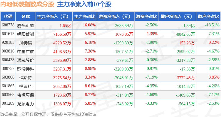 资金流向方面,内地低碳(000977)指数成份股当日主力资金净流出合计48.22亿元,游资资金净流入合计15.24亿元,散户资金净流入合计33.29亿元。成份股资金流向详情见下表: