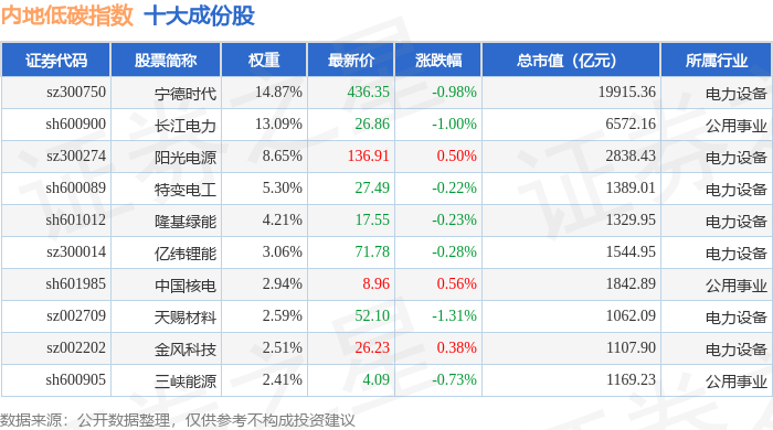 内地低碳(000977)指数十大成份股详情如下: