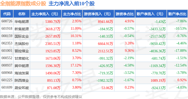 资金流向方面,全指能源(000986)指数成份股当日主力资金净流出合计6.76亿元,游资资金净流入合计3.97亿元,散户资金净流入合计2.79亿元。成份股资金流向详情见下表: