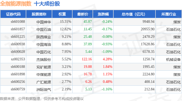 全指能源(000986)指数十大成份股详情如下: