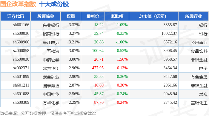 证券之星消息,4月22日,国企改革(399974)指数报收于1959.29点,涨0.62%,成交1873.33亿元,换手率0.8%。当日该指数成份股中,上涨的有43家,紫光股份以8.37%的涨幅领涨,下跌的有55家,中国联通以3.43%的跌幅领跌。