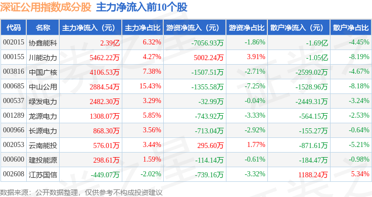 资金流向方面,深证公用(399622)指数成份股当日主力资金净流入合计1.39亿元,游资资金净流出合计4927.32万元,散户资金净流出合计8980.01万元。成份股资金流向详情见下表: