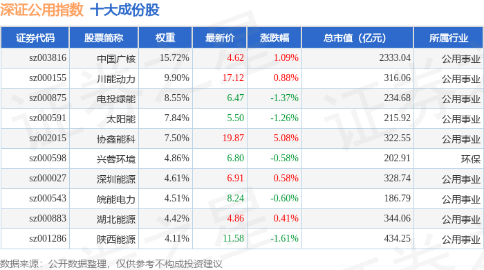 证券之星消息,4月22日,深证公用(399622)指数报收于2052.06点,涨0.57%,成交119.63亿元,换手率1.36%。当日该指数成份股中,上涨的有11家,协鑫能科以5.08%的涨幅领涨,下跌的有8家,陕西能源以1.61%的跌幅领跌。