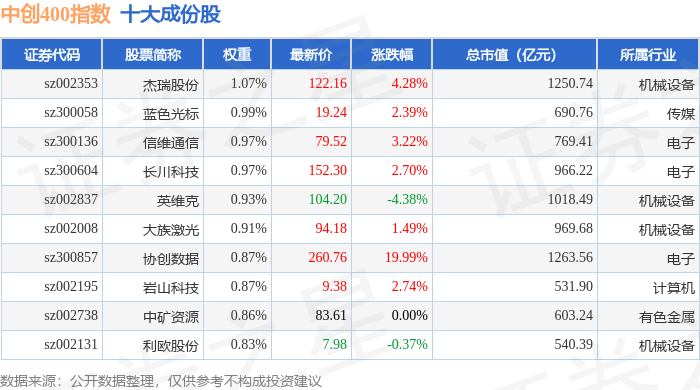 证券之星消息,4月22日,中创400(399624)指数报收于2935.57点,涨1.54%,成交3938.96亿元,换手率3.37%。当日该指数成份股中,上涨的有256家,协创数据以19.99%的涨幅领涨,下跌的有136家,捷佳伟创以13.24%的跌幅领跌。