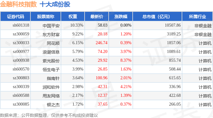 证券之星消息,4月22日,金融科技(399699)指数报收于4076.67点,涨1.73%,成交562.78亿元,换手率2.71%。当日该指数成份股中,上涨的有73家,金证股份以10.0%的涨幅领涨,下跌的有13家,雄帝科技以5.37%的跌幅领跌。