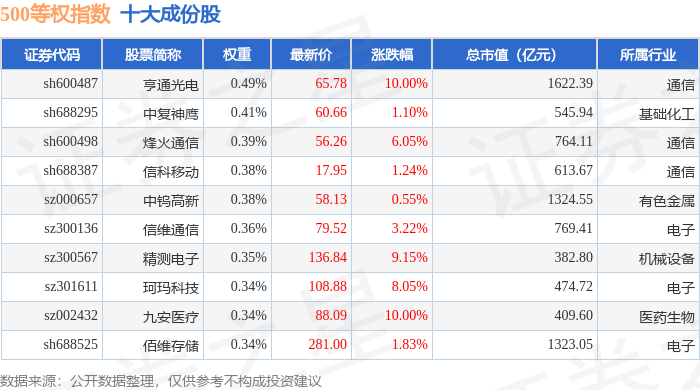 证券之星消息,4月22日,500等权(399982)指数报收于9931.98点,涨1.05%,成交5019.52亿元,换手率1.9%。当日该指数成份股中,上涨的有305家,协创数据以19.99%的涨幅领涨,下跌的有177家,捷佳伟创以13.24%的跌幅领跌。