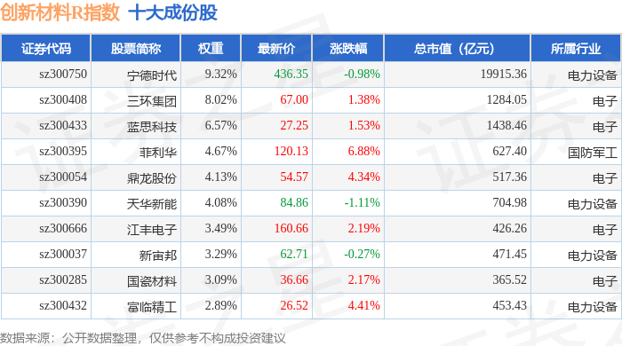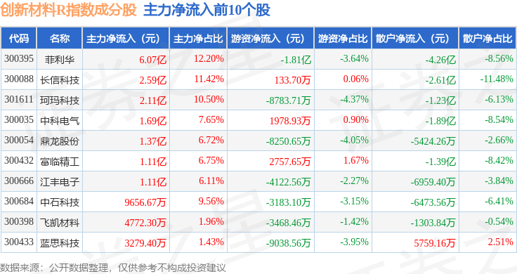 资金流向方面,创新材料R(470039)指数成份股当日主力资金净流出合计9.01亿元,游资资金净流入合计4.76亿元,散户资金净流入合计4.25亿元。成份股资金流向详情见下表: