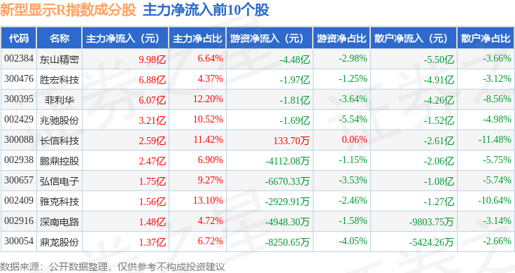 资金流向方面,新型显示R(470048)指数成份股当日主力资金净流入合计33.24亿元,游资资金净流出合计15.34亿元,散户资金净流出合计17.9亿元。成份股资金流向详情见下表: