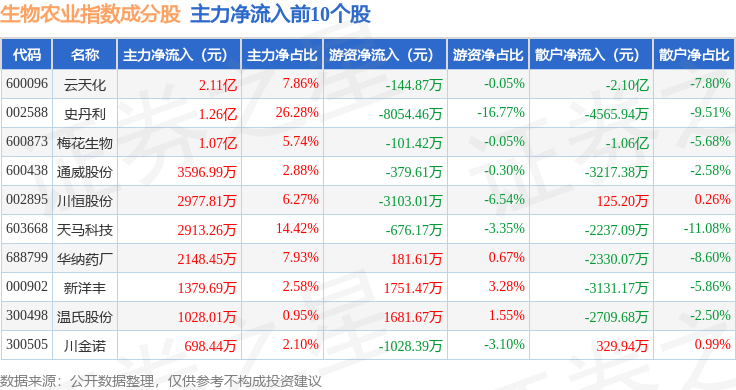 资金流向方面,生物农业(980072)指数成份股当日主力资金净流出合计7.02亿元,游资资金净流入合计1.04亿元,散户资金净流入合计5.72亿元。成份股资金流向详情见下表: