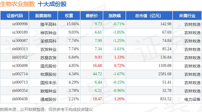 近10日内生物农业(980072)指数成份股做了调整,新纳入了1只股票,剔除了1只股票。