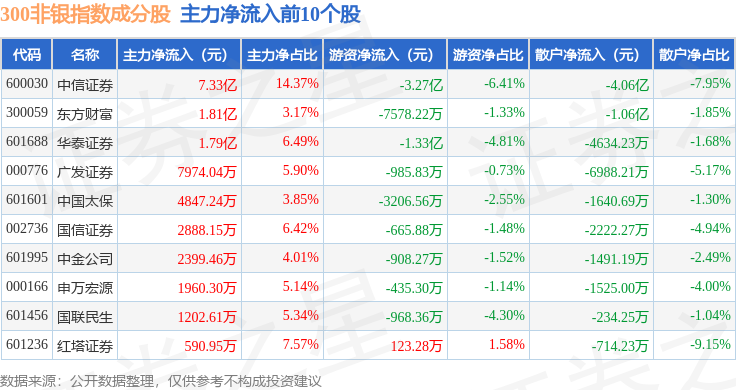 资金流向方面,300非银(000849)指数成份股当日主力资金净流入合计4.26亿元,游资资金净流出合计4.09亿元,散户资金净流出合计1705.57万元。成份股资金流向详情见下表: