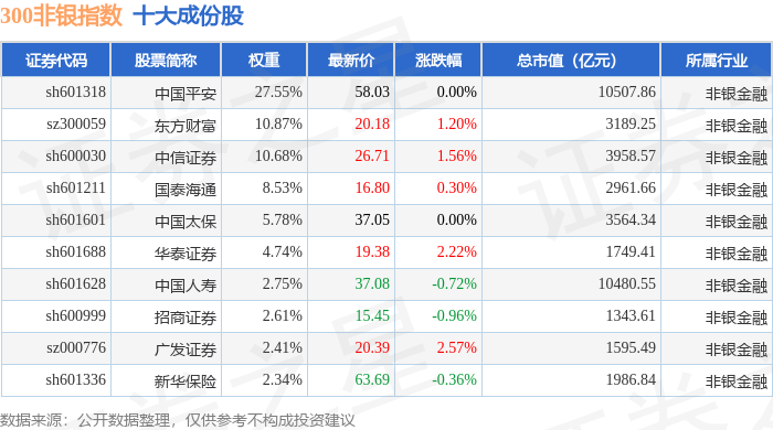 300非银(000849)指数十大成份股详情如下: