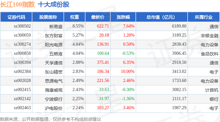 长江100(399278)指数十大成份股详情如下: