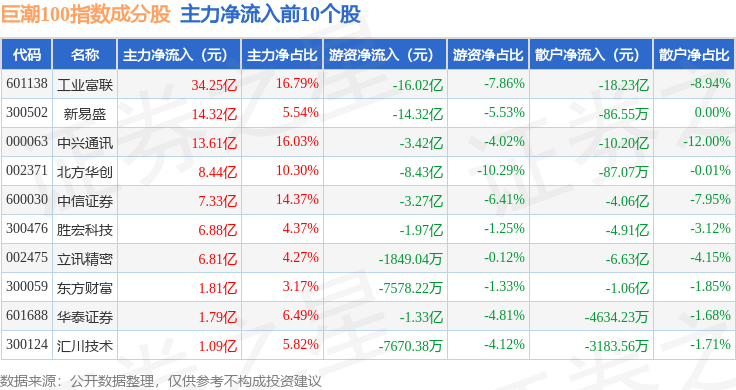 资金流向方面,巨潮100(399313)指数成份股当日主力资金净流出合计1.39亿元,游资资金净流出合计18.91亿元,散户资金净流入合计20.3亿元。成份股资金流向详情见下表: