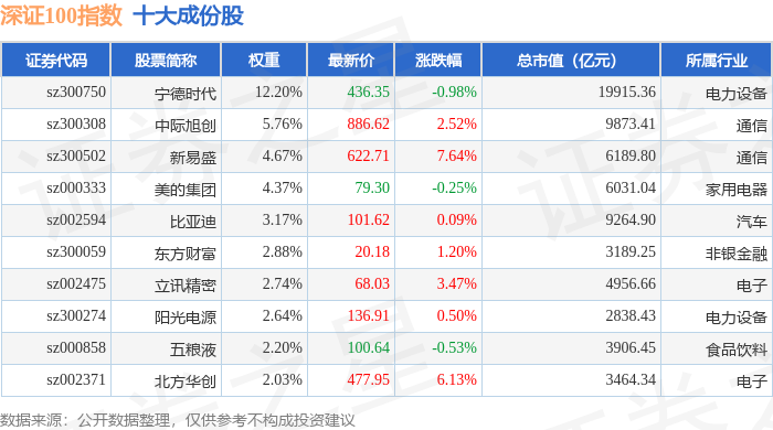 深证100(399330)指数十大成份股详情如下: