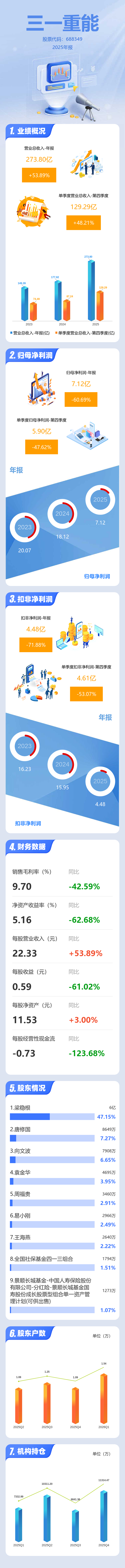 证券之星消息,三一重能2025年年报显示,当年度公司主营收入273.8亿元,同比上升53.89%;归母净利润7.12亿元,同比下降60.69%;扣非净利润4.48亿元,同比下降71.88%;其中2025年第四季度,公司单季度主营收入129.29亿元,同比上升48.21%;单季度归母净利润5.9亿元,同比下降47.62%;单季度扣非净利润4.61亿元,同比下降53.07%;负债率68.84%,投资收益1.85亿元,财务费用-2160.3万元,毛利率9.7%。
