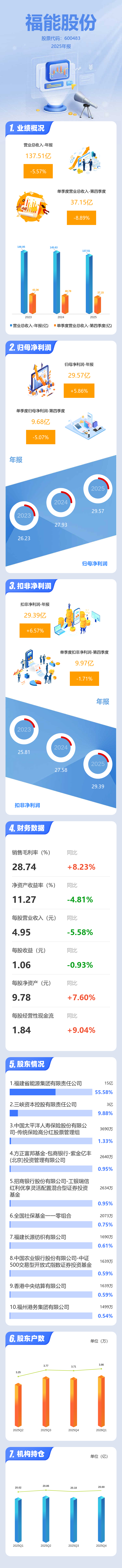 证券之星消息,福能股份2025年年报显示,当年度公司主营收入137.51亿元,同比下降5.58%;归母净利润29.57亿元,同比上升5.87%;扣非净利润29.39亿元,同比上升6.58%;其中2025年第四季度,公司单季度主营收入37.15亿元,同比下降8.89%;单季度归母净利润9.68亿元,同比下降5.08%;单季度扣非净利润9.97亿元,同比下降1.72%;负债率41.82%,投资收益13.18亿元,财务费用3.68亿元,毛利率28.74%。