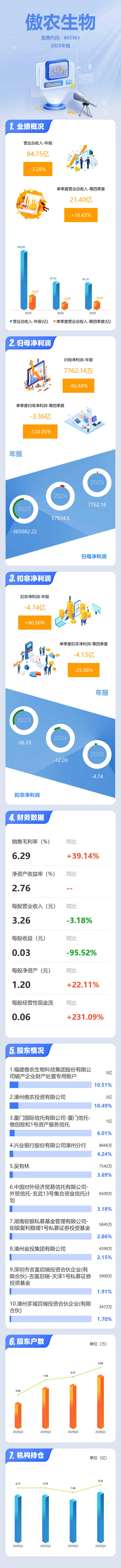 证券之星消息,傲农生物2025年年报显示,当年度公司主营收入84.75亿元,同比下降3.29%;归母净利润7762.16万元,同比下降86.6%;扣非净利润-4.74亿元,同比上升60.56%;其中2025年第四季度,公司单季度主营收入21.4亿元,同比上升16.44%;单季度归母净利润-3.36亿元,同比下降124.05%;单季度扣非净利润-4.13亿元,同比下降25.06%;负债率59.05%,投资收益5.18亿元,财务费用1.4亿元,毛利率6.29%。