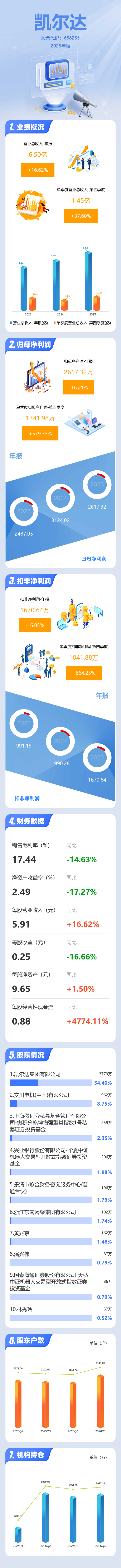 证券之星消息,凯尔达2025年年报显示,当年度公司主营收入6.5亿元,同比上升16.62%;归母净利润2617.32万元,同比下降16.22%;扣非净利润1670.64万元,同比下降16.06%;其中2025年第四季度,公司单季度主营收入1.45亿元,同比上升37.6%;单季度归母净利润1341.98万元,同比上升579.73%;单季度扣非净利润1041.88万元,同比上升664.25%;负债率15.0%,投资收益959.12万元,财务费用-163.74万元,毛利率17.44%。