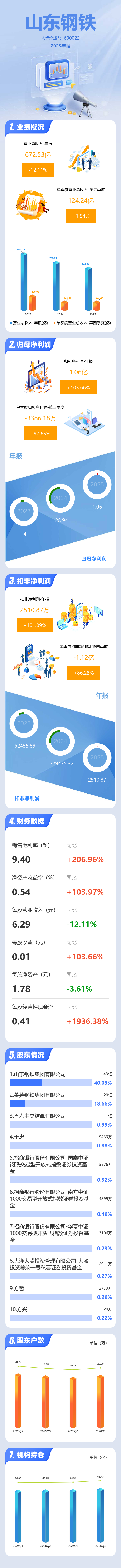 证券之星消息,山东钢铁2025年年报显示,当年度公司主营收入672.53亿元,同比下降12.11%;归母净利润1.06亿元,同比上升103.66%;扣非净利润2510.87万元,同比上升101.09%;其中2025年第四季度,公司单季度主营收入124.24亿元,同比上升1.94%;单季度归母净利润-3386.18万元,同比上升97.65%;单季度扣非净利润-1.12亿元,同比上升86.29%;负债率64.71%,投资收益993.88万元,财务费用5.83亿元,毛利率9.4%。