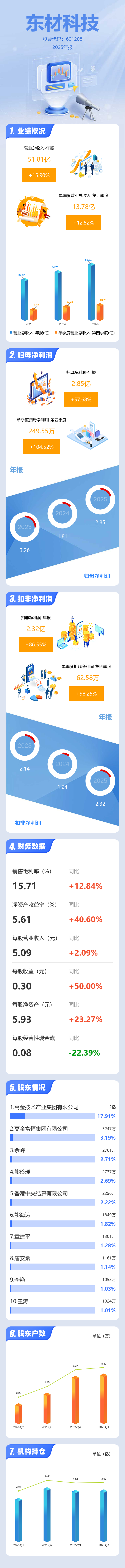 证券之星消息,东材科技2025年年报显示,当年度公司主营收入51.81亿元,同比上升15.91%;归母净利润2.85亿元,同比上升57.68%;扣非净利润2.32亿元,同比上升86.56%;其中2025年第四季度,公司单季度主营收入13.78亿元,同比上升12.52%;单季度归母净利润249.55万元,同比上升104.52%;单季度扣非净利润-62.58万元,同比上升98.26%;负债率45.76%,投资收益2527.09万元,财务费用1.06亿元,毛利率15.71%。