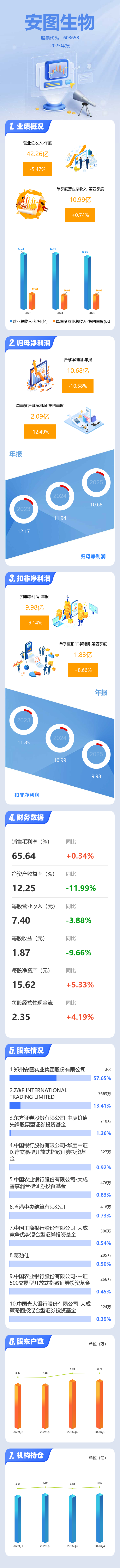 证券之星消息,安图生物2025年年报显示,当年度公司主营收入42.26亿元,同比下降5.47%;归母净利润10.68亿元,同比下降10.59%;扣非净利润9.98亿元,同比下降9.14%;其中2025年第四季度,公司单季度主营收入10.99亿元,同比上升0.74%;单季度归母净利润2.09亿元,同比下降12.5%;单季度扣非净利润1.83亿元,同比上升8.66%;负债率26.64%,投资收益1.05亿元,财务费用939.27万元,毛利率65.64%。
