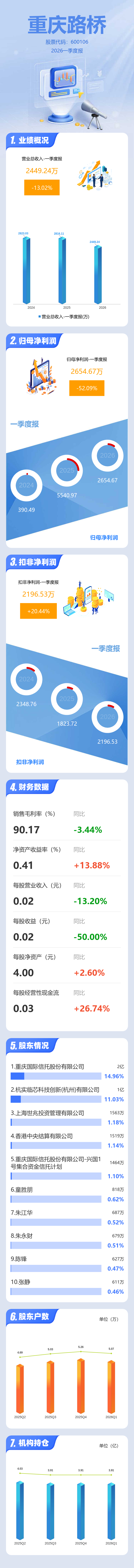 证券之星消息,重庆路桥2026年一季报显示,一季度公司主营收入2449.24万元,同比下降13.03%;归母净利润2654.67万元,同比下降52.09%;扣非净利润2196.53万元,同比上升20.44%;负债率24.64%,投资收益1710.18万元,财务费用607.28万元,毛利率90.17%。