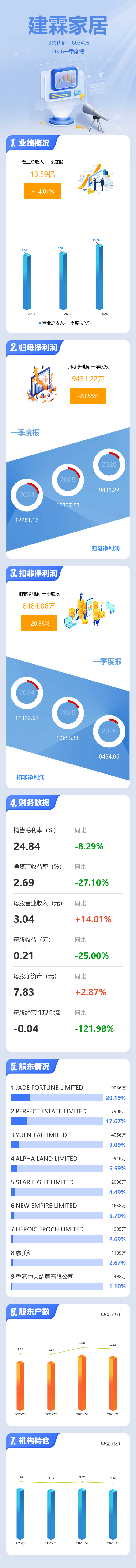 证券之星消息,建霖家居2026年一季报显示,一季度公司主营收入13.59亿元,同比上升14.02%;归母净利润9431.22万元,同比下降23.56%;扣非净利润8484.06万元,同比下降20.38%;负债率37.34%,投资收益672.93万元,财务费用2819.37万元,毛利率24.84%。