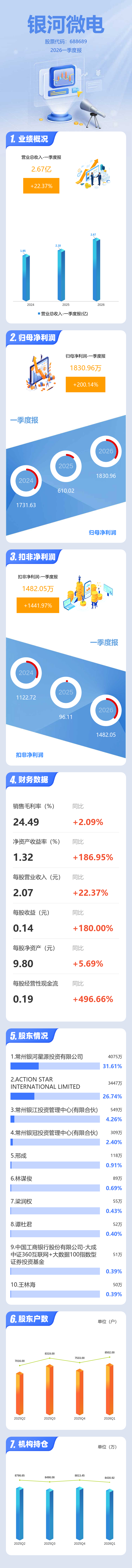 证券之星消息,银河微电2026年一季报显示,一季度公司主营收入2.67亿元,同比上升22.37%;归母净利润1830.96万元,同比上升200.15%;扣非净利润1482.05万元,同比上升1441.97%;负债率39.13%,投资收益24.06万元,财务费用1220.59万元,毛利率24.49%。